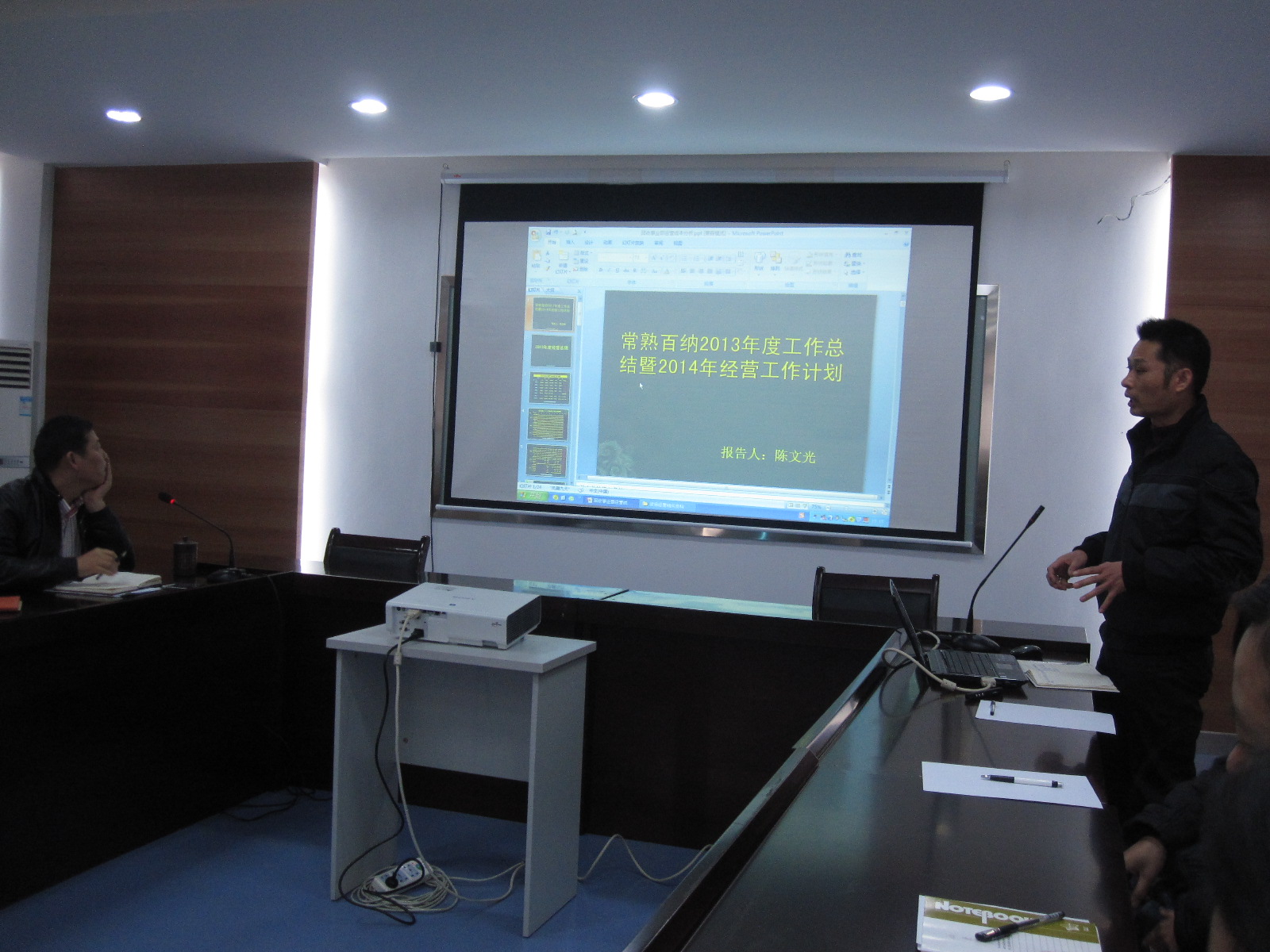 2013年12月21日,公司在百纳会议室召开了年终会议,参会人员为总部所有管理人员及货场主管。 会议内容: 一、陈副总发言: 1、2013 年废纸收购量完成率和废塑完成率。 2、各货场2013 年1 月-11 月各项成本费用、绩效、废塑成本分析和品质成本。 3、解析2014 年经营计划: ①、人力资源2014 年的招聘目标及人员; ②、1-12 月各货场生产指标及收购目标; ③、降本措施:维修、扣点、物流、工艺改善(脱标率)的提升; ④、货场管理改善措施:服务意识提升,提高工作效率; ⑤、周转资金支付管理办法的执行。 二、唐总发言: 1、2014 年公司的组织架构及部门人员的公布。 2、财务部的重心是加强对统计的管理,加快付款手续和时间。 3、安全生产的再次强调。 三、李书记发言: 1、2014 年,总部人员的责任压力比以前大,精神状态要好,主动积极的做事,多做实事,加强服务意识。 2、规章制度的遵守,加强制度的管理,做到没有特殊的员工,没有特殊的客户,没有特殊的事情。 3、货场主管的人性管理,要有凝合力、团聚力、向心力。 4、执行力的加强。 5、年终总结与明年工作计划的材料提交。 6、1 月18 日,在玖隆公司召开总结表彰大会暨新春联欢会,希望各货场、各部门积极参与,踊跃报名参加节目。